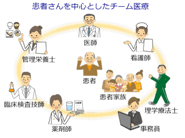 医師、看護師、薬剤師、管理栄養士、理学療法士、臨床検査技師など様々な医療専門職が連携して糖尿病患者の自己管理を支援するチームです。